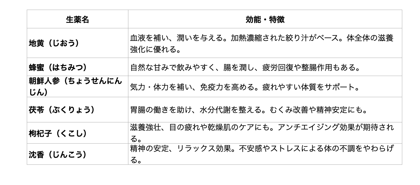 地黄や枸杞子が腎を養い、朝鮮人参や蜂蜜がエネルギーを補いながら、心と体にやさしく寄り添ってくれます。