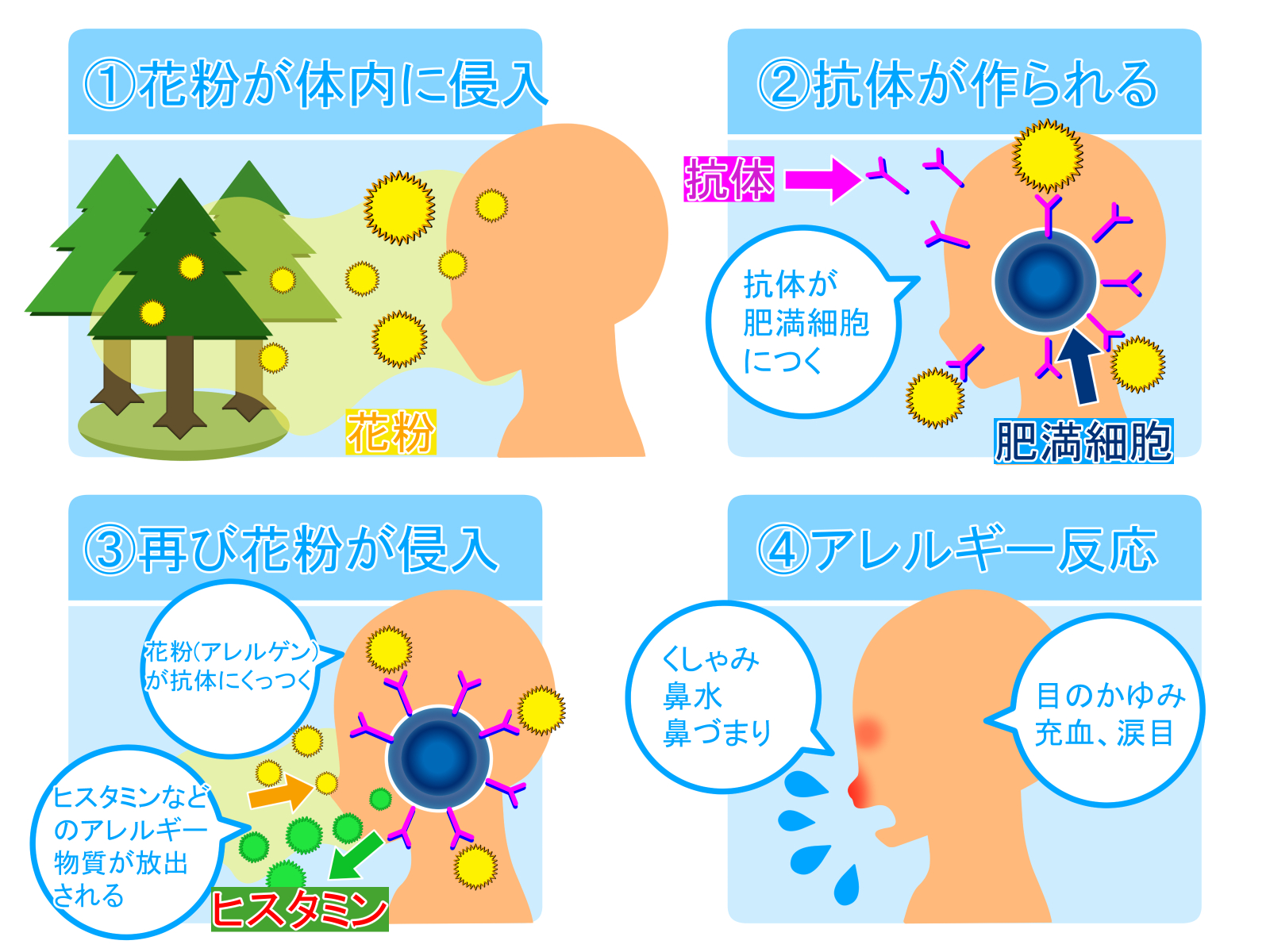 これにより、くしゃみ・鼻水・鼻づまり・目のかゆみなどの症状が引き起こされます。