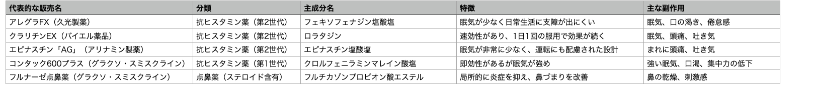 花粉症の症状を軽減するために、以下のような医薬品が広く用いられています。それぞれの特徴と副作用についても押さえておきましょう: