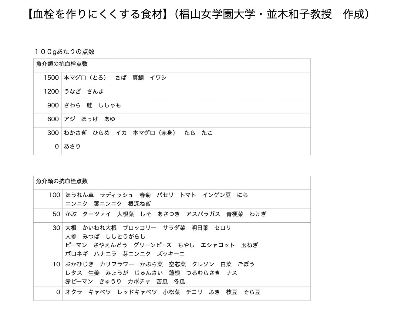参考になるのが、椙山女学園大学・並木和子教授が作成した**「血栓を作りにくくする食品リスト」**。