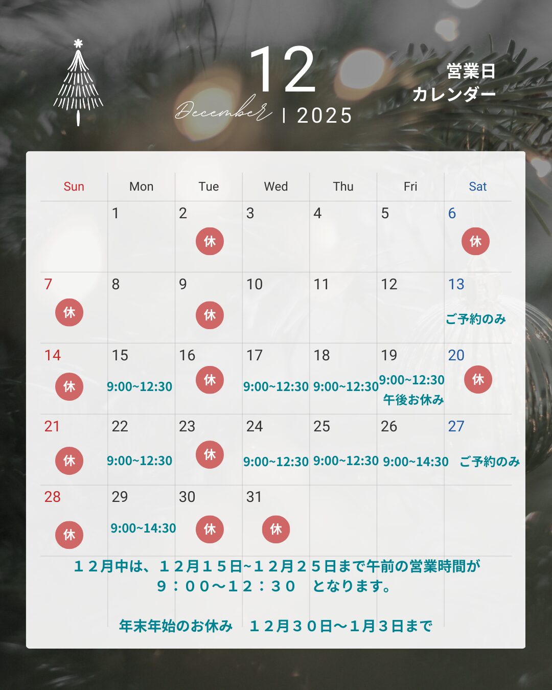 12月15日〜12月25日までは、午前の営業時間 9:00〜12:30 となります。