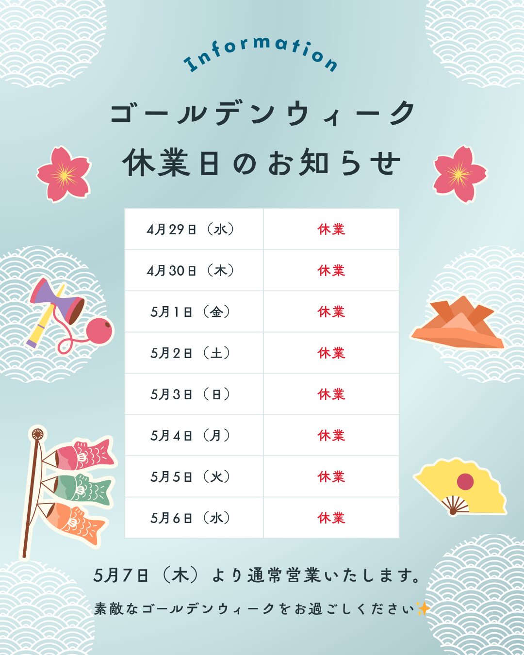 🌸 GWお休みのお知らせ 🌸